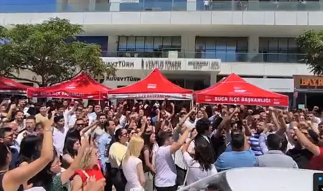 İzmir Büyükşehir Belediyesi'ne düzenlenen operasyonda gözaltına alınanlardan 99'u için tutuklama talep edilirken adliye önünde toplanan CHP'liler operasyona tepki gösteriyor.