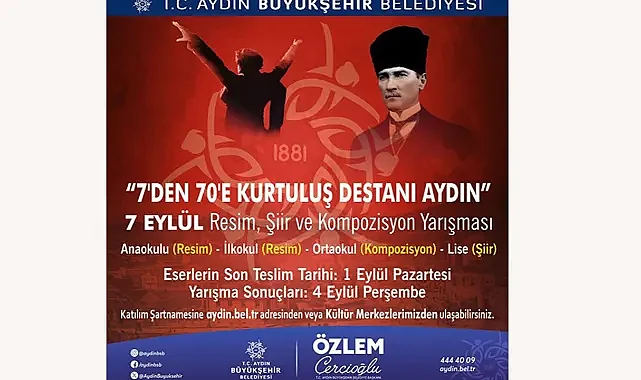 Aydın Büyükşehir Belediye Başkanı Özlem Çerçioğlu, Aydın’ın düşman işgalinden kurtuluşunun yıldönümünde “7’den 70’e Kurtuluş Destanı Aydın” temalı ödüllü resim, şiir ve kompozisyon yarışmasıyla öğrencileri coşkuya ortak olmaya davet ediyor.