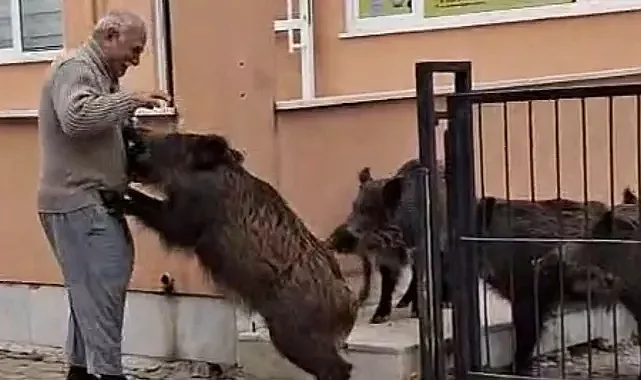 Domuzlar okul bahçesine girdi... Yaşlı adam elleriyle besledi!
