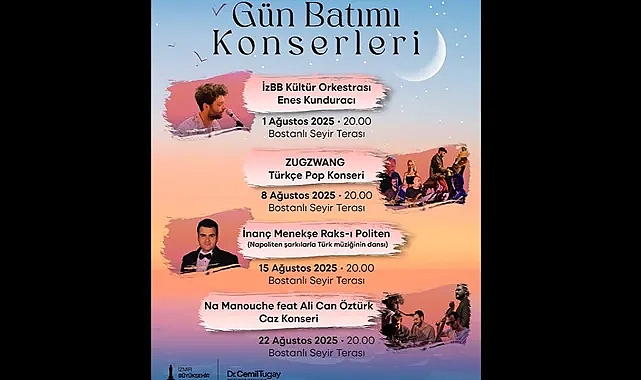 İzmirli müzikseverlerin ilgiyle takip ettiği Gün Batımı konserleri, İzmir Büyükşehir Belediyesi organizasyonunda ağustos ayında da Bostanlı Seyir Terası’nda olacak. Konser dizisi, 1 Ağustos’ta İzmir Büyükşehir Belediyesi Kültür Orkestrası’nın başarılı sanatçısı Enes Kunduracı ile başlayacak. Zugzwang Türkçe Pop konseri 8 Ağustos’ta, İnanç Menekşe Raks-ı Politen 15 Ağustos’ta ve Na Manouche feat Ali Can Öztürk Caz konseri ise 22 Ağustos’ta yapılacak. Tüm etkinlikler Bostanlı Seyir Terası’nda saat 20.00’de başlayacak. İzmir’in eşsiz gün batımı manzarasına karşı müzikle buluşmak isteyen müzikseverler, konserlere ücretsiz katılabilecek.