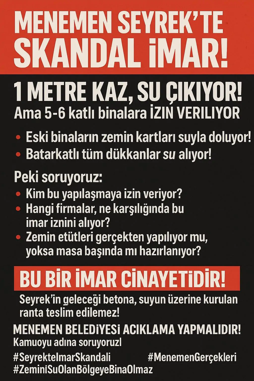 Asıl Bomba Lise mezunu bir teknisyenGeçtiğimiz günlerde gündeme getirdiğimiz imar işi: Menemen ilçesinin tüm İmar durumu, Yapı ruhsatı, yapı kontrolü, iskan belgesine kadar hepsini aynı kişi kontrol ediyor, yani ilçenin tüm imarı bir lise mezunu teknisyenin elinde! Tek bir imza ile çıkıyor hepsi!Peki bunun ne zararı var? Menemen bir ova, sadece İzmir değil Türkiyenin en verimli ovalarından biri. İlçenin bozulan silüetini bir kenara bırakırsak, Fay hatlarının en tehlikeli olduğu yerlerden biri.Seyrek’te 1 metre temel kazıyorsun su çıkıyor, zemin katlar bile su ile dolarkenSoruyoruz.Kim bu yapılaşmaya izin veriyor?Hangi firmalar ne karşılığında bu imar izinlerini alıyor?Zemin etütleri gerçekten yapılıyor mu? yoksa tek kişi masa başında sadece onay mı veriyor?5-6 kat yapılaşmaların olduğu yerde nasıl oluyorda 15-16 katlı binalar yükseliyor?Jeofizik raporlarını inceleyen bu teknisyen arkadaşımız ne kadar liyakatli?Gelecekte bir deprem olduğunda bu binalarda can kayıpları yaşanırsa kim hesabını verebilir?Daha soracak çok soru var, Kamuoyu adına soruyoruzMenemen Belediyesi açıklama yapmalıdır!!!