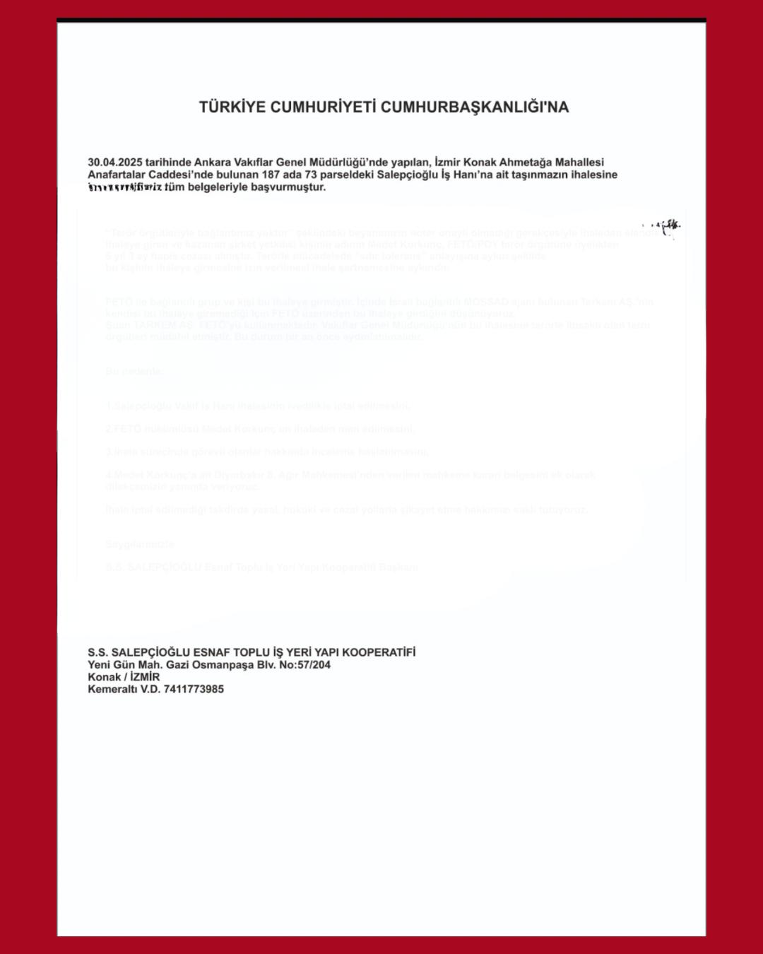 4. (Soru):Süreçte adı geçen siyasi ve bürokratik isimlerin sessizliği sizce ne anlama geliyor?Muhammed Çopur (Yanıt):Bu sessizlik çok manidar. Vakıflar Genel Müdürü Sinan Aksu, olayın tümüne şahitlik eden AK Parti Genel Başkan Yardımcısı Sayın Hamza Dağ, Salepçioğlu Caminin hemen yanındaki imam evini TARKEM’e veren İzmir Vakıflar Bölge Müdürü Tahir Emre Can ve AK Parti İzmir İl Yürütme Kurulundan Cüneyd Dayhan ile Deniz Doğan sürecin tam merkezindeler. Ama ne gariptir ki, bu isimlerin hiçbirinden kamuoyuna tek bir açıklama yapılmadı. Bu sessizlik ya bir itiraftır ya da daha kötüsü, susarak onay verme hâlidir.5. (Soru):Son olarak kamuoyuna ve yetkililere ne mesaj vermek istersiniz?Muhammed Çopur (Yanıt):Sayın Cumhurbaşkanımız Recep Tayyip Erdoğan’a ve devletimizin büyüklerine çağrımız net: Bu ihale iptal edilmelidir! Bu mesele bir şirket meselesi değildir; bu bir vicdan, emanet ve milli güvenlik meselesidir. Vakıf mallarımızın rant kapısı hâline getirilmesine dur denmelidir. Bu mücadele, sadece esnafın değil, bu millete yüzyıllardır emanet edilen değerlerin mücadelesidir.Esnaf bu işin peşini bırakmayacak!