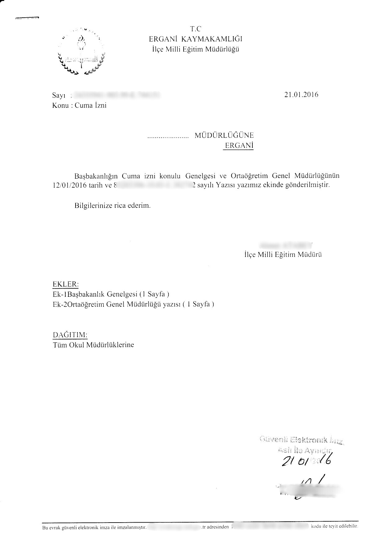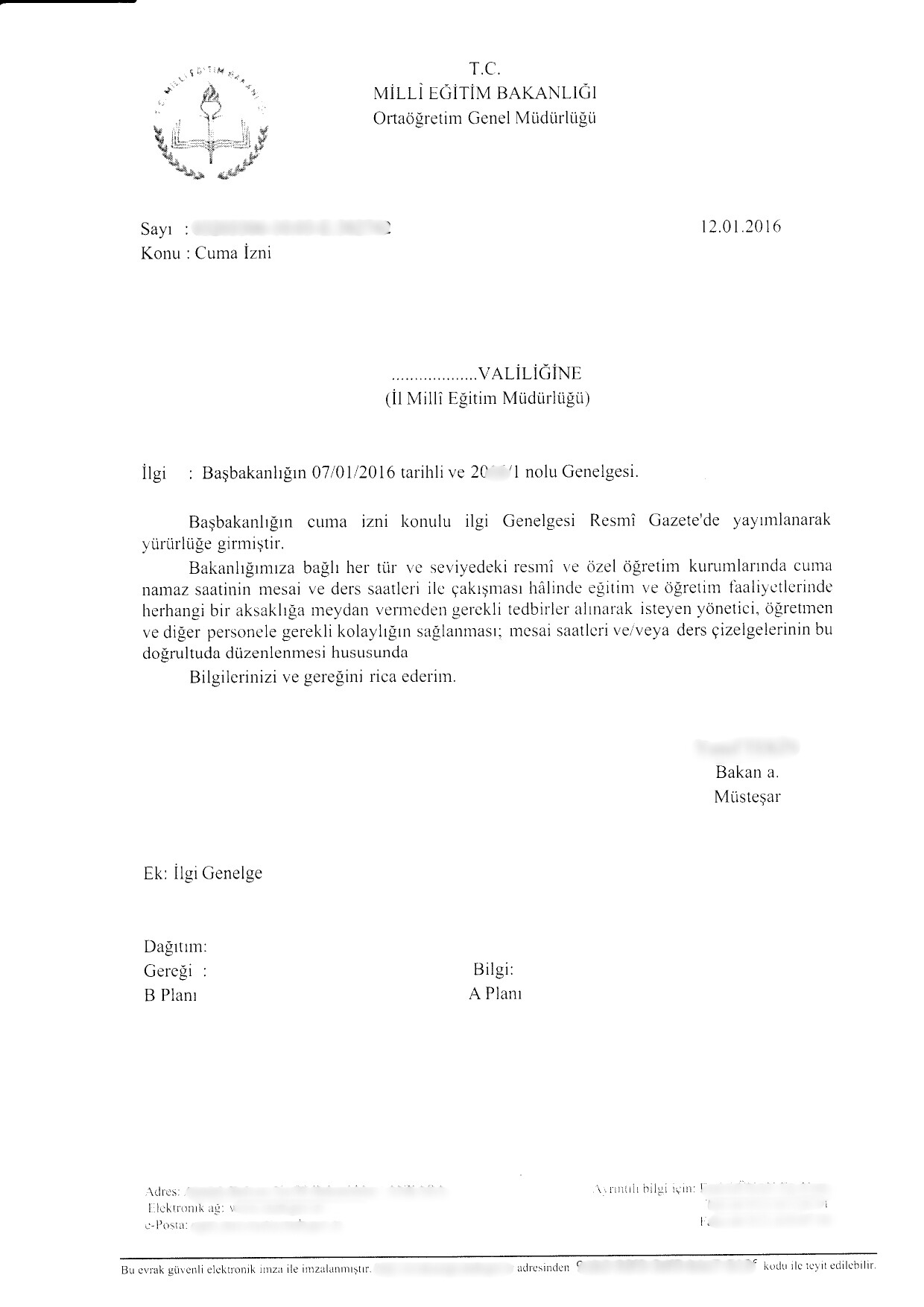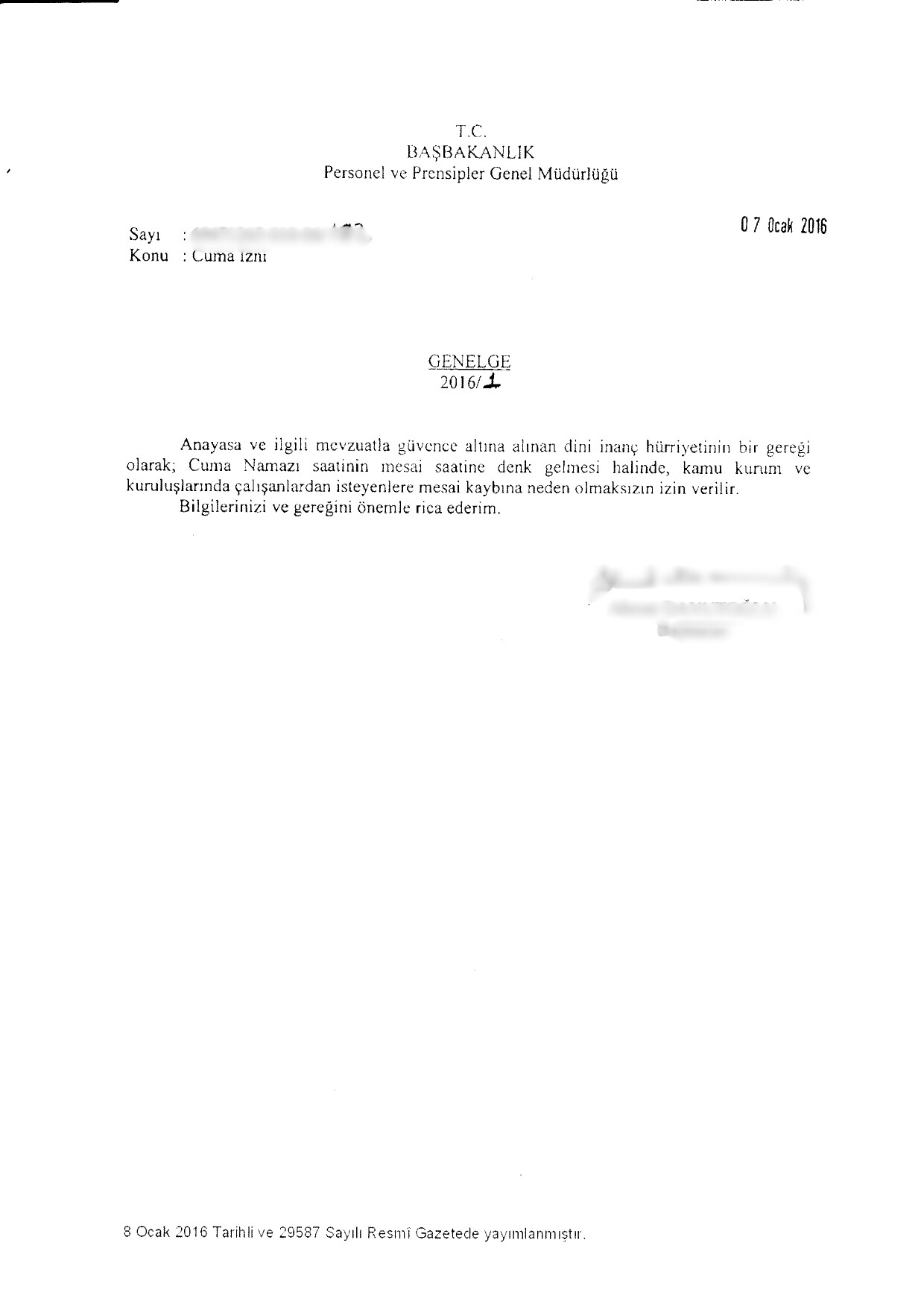 07.01.2016 tarih ve 2016/1 sayılı Başbakanlık Genelgesi Resmi Gazete'de yayımlanarak yürürlüğe girmiştir. Genelge; Anayasal bir hak olan İnanç ve İbadet Özgürlüğü kapsamında kamu personeline, cuma namazı için izin veriyor.