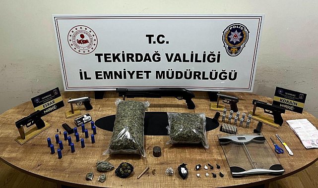Çorlu Emniyet Müdürlüğü Narkotik Suçlarla Mücadele Büro Amirliği ekipleri, Çorlu Cumhuriyet Başsavcılığı’nın talimatıyla ‘torbacı’ olarak tabir edilen sokakta uyuşturucu satanlara yönelik çalışma yaptı.Çalışmanın ardından belirlenen şüpheliler N.T. ve L.T.’nin ev ve iş yerlerine baskın düzenlendi. Adreslerde yapılan aramalarda, 1 kilo 450 gram esrar, 20 gram kokain, hassas terazi, bir miktar esrar, ruhsatsız 4 tabanca, 1 av tüfeği, bin 600 dolu makaron, elektronik sigara likitleri ele geçirildi. Gözaltına alınan N.T. ve L.T., emniyetteki işlemlerinin ardından sevk edildikleri adliyede çıkarıldıkları mahkemede tutuklandı.