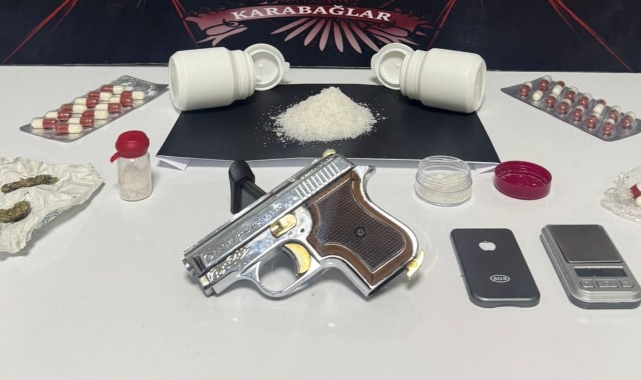 bulundu.Gözaltına alınan şahıslardan P.A. hakkında “Uyuşturucu Madde Ticareti Yapmak”, E.A. hakkında ise “Uyuşturucu Madde Bulundurmak” ve “Ruhsatsız Silah Taşımak” suçlarından adli işlem başlatıldı. Her iki şüpheli, işlemlerinin ardından adli makamlara sevk edilecek.Kaynak / İzmir Türk TV
